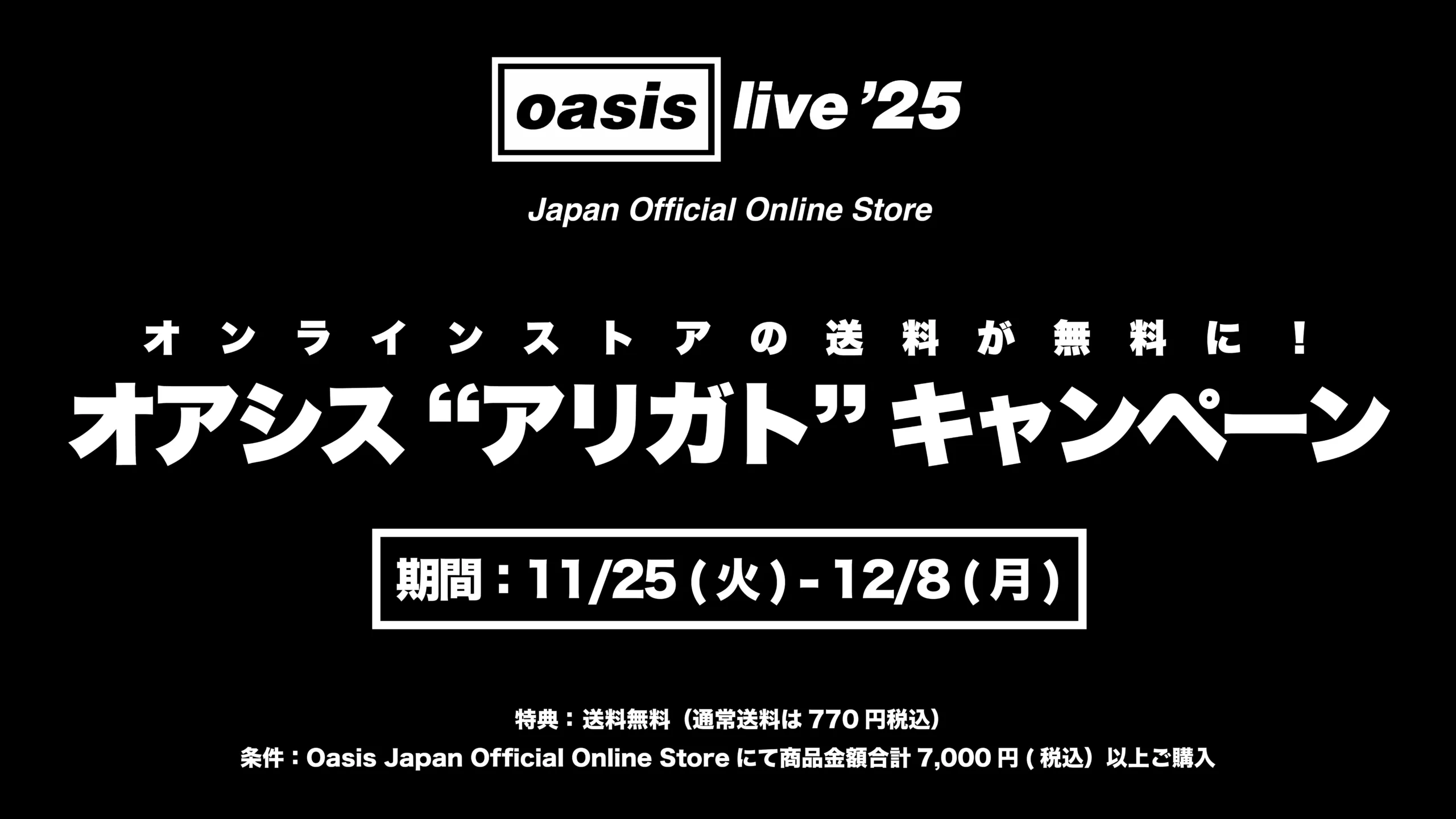 Oasis Live ’25日本公式オンラインストア「Oasis Japan Official Online Store」にて、一回7,000円(税込)以上のご購入で送料無料の【オアシス “アリガト ” キャンペーン】を、11月25日(火) 00:00 より開始いたします。